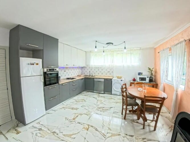 The apartment features a private garden and terrace with mountain views, perfect for relaxing mornings or evening dinners outdoors. Inside you’ll find a cozy living room, a fully equipped kitchen, a dining area, and one bathroom. Free Wi-Fi, air conditioning, and private parking are provided.
